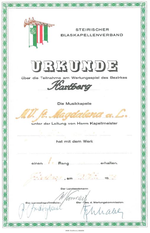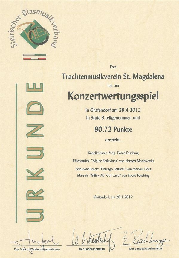 Unsere Erfolge 1978 Wertungsspiel in Hartberg1. Rang 16.04.1988 Wertungsspiel in Waltersdorf (Stufe B) Sehr guter Erfolg 04.07.1993 Marschmusikwertung in Kemeten Sehr guter Erfolg 04.05.2002 Konzertwertung in Vorau (Stufe B) Sehr guter Erfolg 28.06.2003 Marschmusikwertung in Kindberg (Stufe B) Sehr guter Erfolg 12.09.2004 Marschmusikwertung in Eggersdorf bei Graz (Stufe B) Marsch: "Prager Gruß" Sehr guter Erfolg 03.09.2005 Marschmusikwertung in Pinggau (Stufe C) Marsch: "Start Frei!" Sehr guter Erfolg 29.04.2006 Konzertwertung in Grafendorf(Stufe C) Sehr guter Erfolg 24.04.2010 Konzertwertung in Grafendorf(Stufe C) Ausgezeichneter Erfolg 28.04.2012 Konzertwertung in Grafendorf (Stufe B) 90,72 Punkte 06.07.2013 Marschmusikwertung in St. Jakob am Walde (Stufe C) 91,06 Punkte 2014 Überreichung Robert-Stolz Preis 07.11.2015 Wertungsspiel Polka-Walzer-Marsch in Kaindorf(Stufe B) 91,16 Punkte 16.04.2016 Konzertwertung in Grafendorf(Stufe B)92,33 Punkte 09.09.2017 Marschmusikwertung in Kaindorf(Stufe C)89,53 Punkte 2018 Überreichung des 3. Steirischen Panthers und der 2. Robert-Stolz-Medaille
