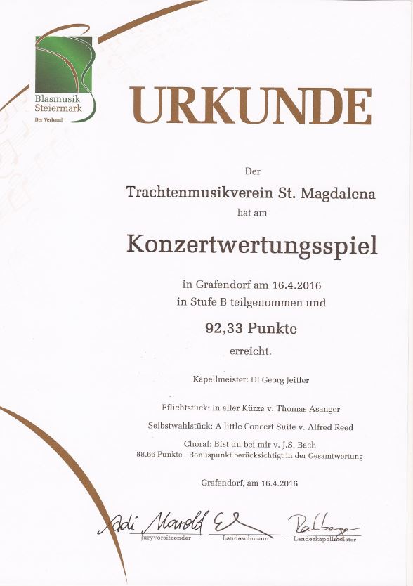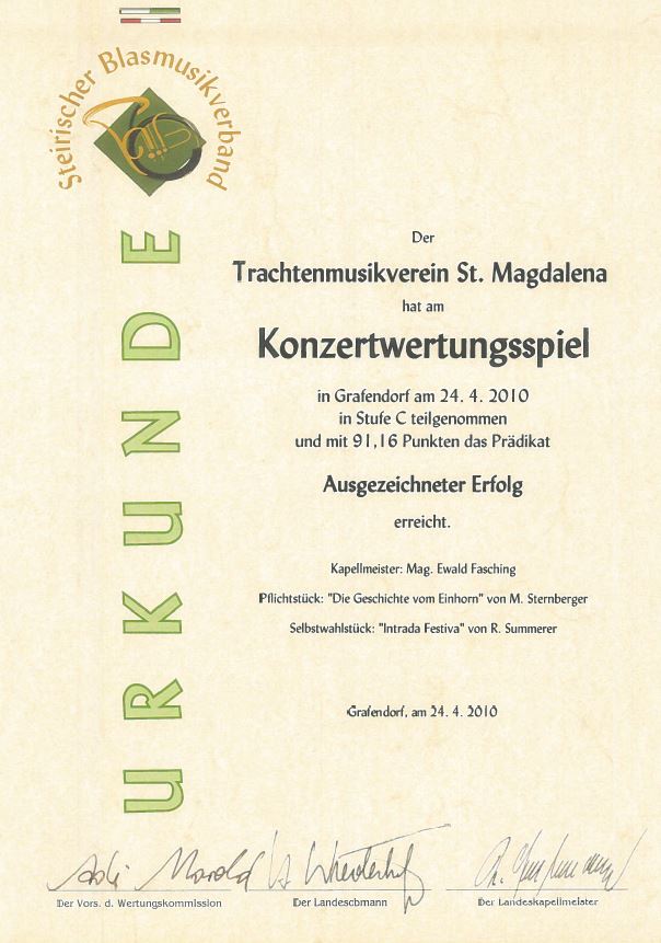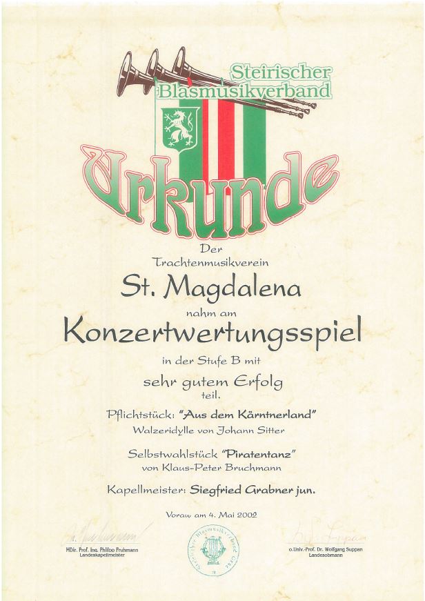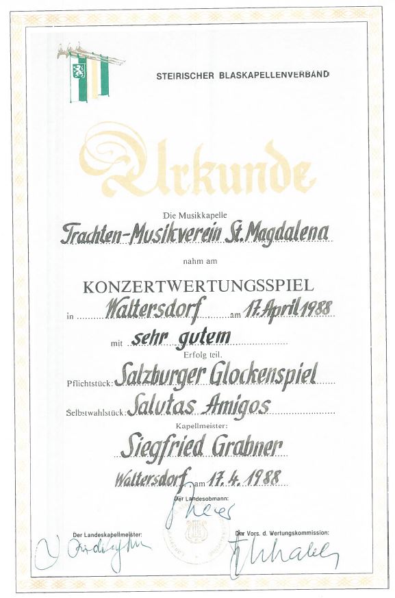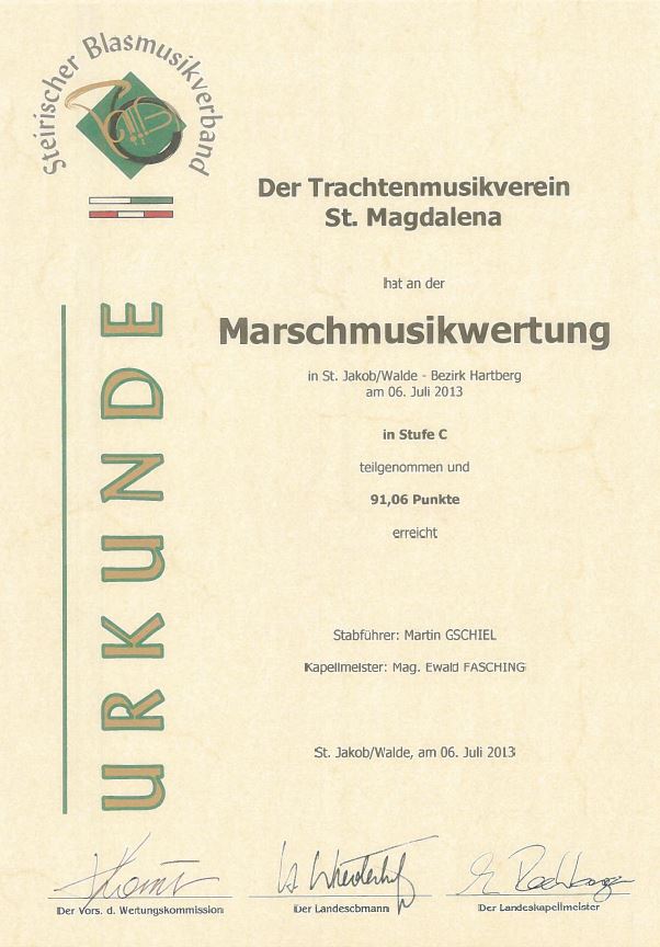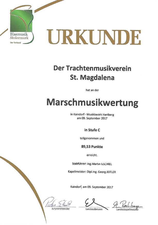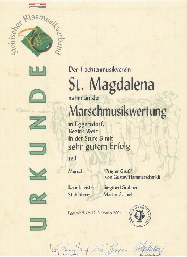 Unsere Erfolge 1978 Wertungsspiel in Hartberg1. Rang 16.04.1988 Wertungsspiel in Waltersdorf (Stufe B) Sehr guter Erfolg 04.07.1993 Marschmusikwertung in Kemeten Sehr guter Erfolg 04.05.2002 Konzertwertung in Vorau (Stufe B) Sehr guter Erfolg 28.06.2003 Marschmusikwertung in Kindberg (Stufe B) Sehr guter Erfolg 12.09.2004 Marschmusikwertung in Eggersdorf bei Graz (Stufe B) Marsch: "Prager Gruß" Sehr guter Erfolg 03.09.2005 Marschmusikwertung in Pinggau (Stufe C) Marsch: "Start Frei!" Sehr guter Erfolg 29.04.2006 Konzertwertung in Grafendorf(Stufe C) Sehr guter Erfolg 24.04.2010 Konzertwertung in Grafendorf(Stufe C) Ausgezeichneter Erfolg 28.04.2012 Konzertwertung in Grafendorf (Stufe B) 90,72 Punkte 06.07.2013 Marschmusikwertung in St. Jakob am Walde (Stufe C) 91,06 Punkte 2014 Überreichung Robert-Stolz Preis 07.11.2015 Wertungsspiel Polka-Walzer-Marsch in Kaindorf(Stufe B) 91,16 Punkte 16.04.2016 Konzertwertung in Grafendorf(Stufe B)92,33 Punkte 09.09.2017 Marschmusikwertung in Kaindorf(Stufe C)89,53 Punkte 2018 Überreichung des 3. Steirischen Panthers und der 2. Robert-Stolz-Medaille